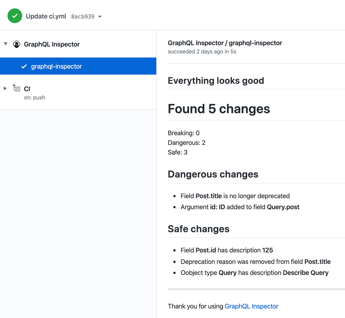 Now on every commit or every Pull Request, the GraphQL Inspector App will annotate every change, next to the line in the code where it happened.